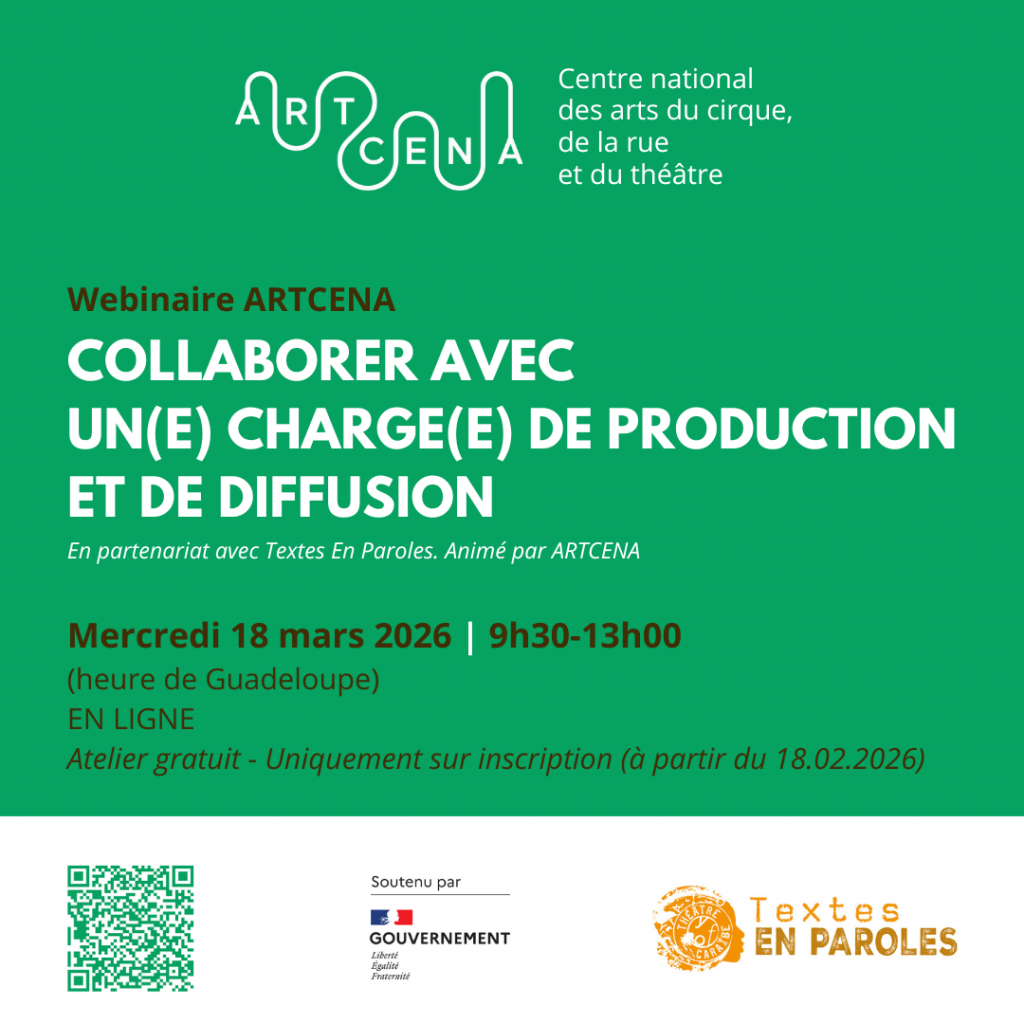 ARTCENA, Centre national des arts du cirque, de la rue et du théâtre, présente, en partenariat avec TEXTES EN PAROLES, l’atelier-webinaire « Collaborer avec un(e) chargé(e) de production et de diffusion », le mercredi 18 mars 2026 de 9h30 à 13h00 (heure de Guadeloupe), en ligne.